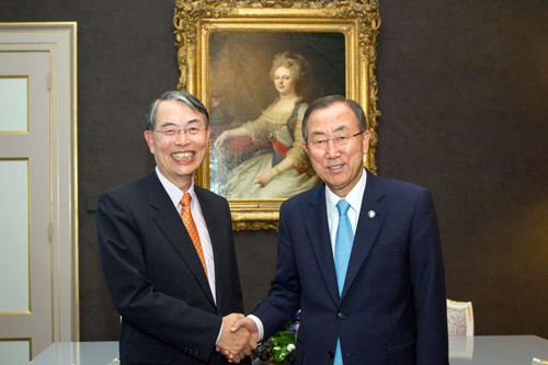 Secretary-General Ban Ki-moon (right) and ICC President Sang-Hyun Song (August 2013). UN Photo/Rick Bajornas