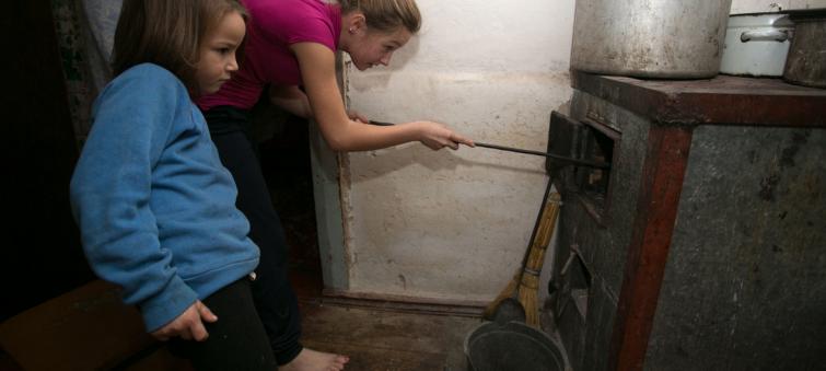 In their Olenivka settlement house in the non-government controlled area of Donetsk region, 11-year old Alika and her six-year old sister Sofia add coal to the stove.