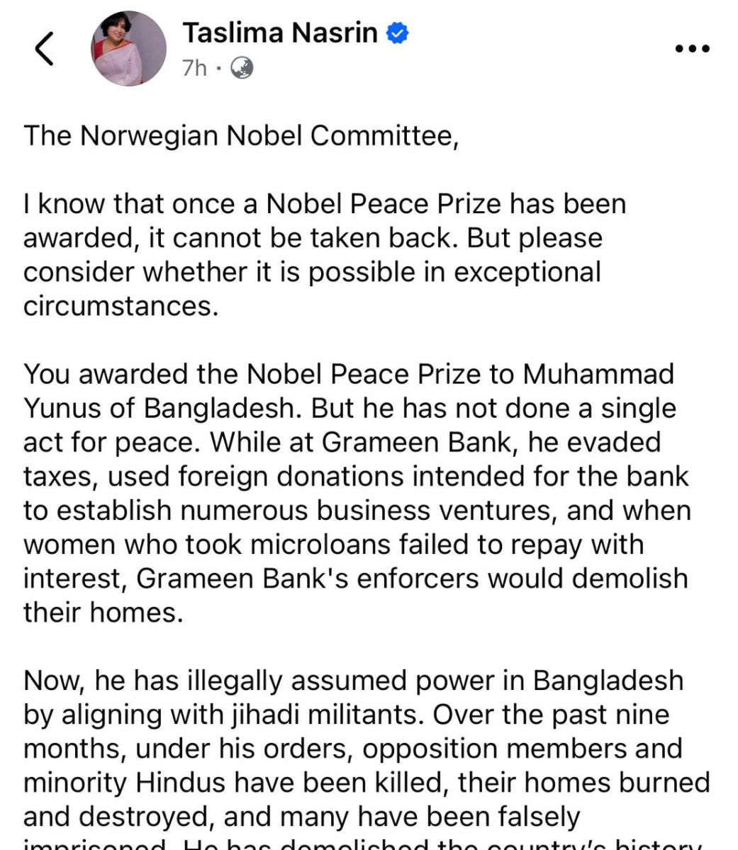 In her letter to the Nobel Committee, Taslima wrote, "You awarded the Nobel Peace Prize to Muhammad Yunus of Bangladesh. But he has not done a single act for peace. While at Grameen Bank, he evaded taxes, used foreign donations intended for the bank to establish numerous business ventures, and when women who took microloans failed to repay with interest, Grameen Bank's enforcers would demolish their homes.