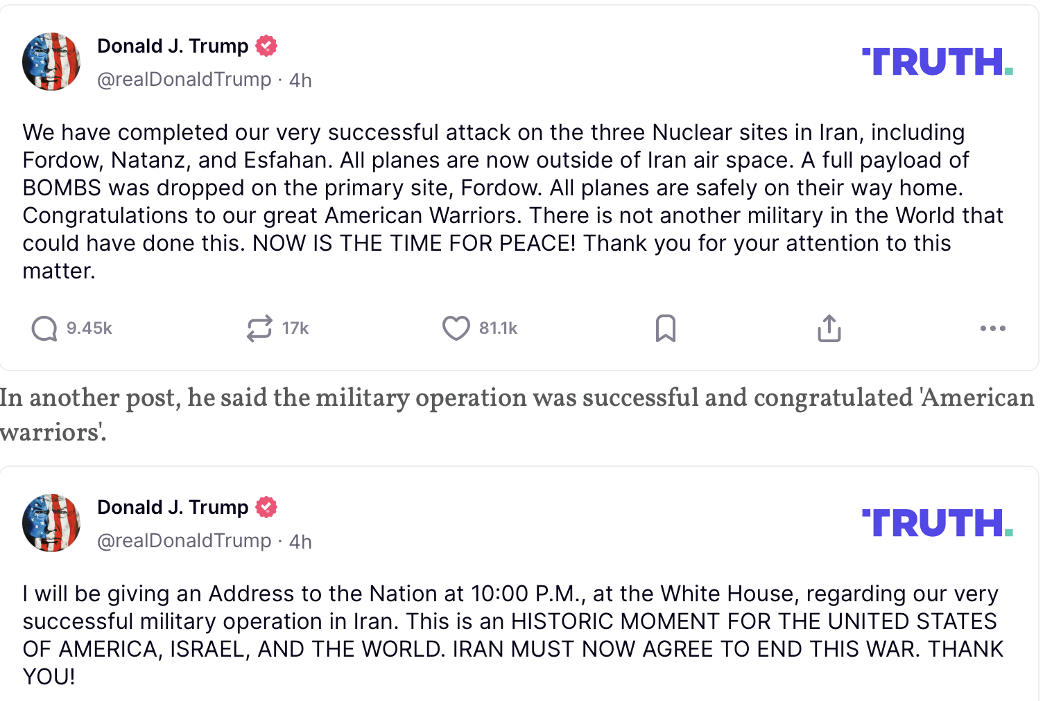 Tonight, I can report to the world that the strikes were a spectacular military success. Iran’s key nuclear enrichment facilities have been completely and totally obliterated. Iran, the bully of the Middle East, must now make peace.