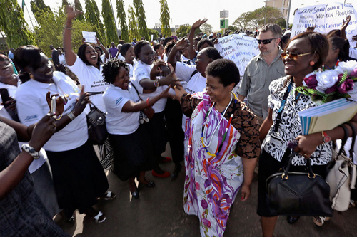 UN Women Executive Director Phumzile Mlambo-Ngcuka (centre) arrives in Juba, South Sudan, on 17 February 2014. Photo: UNMISS/Julio Brathwaite