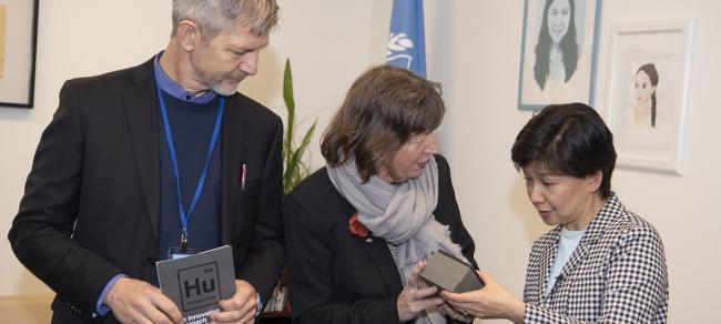 On behalf of the organization behind the metal, IM Swedish Development Partner, Peter Brune and Birthe Müller presented a Humanium-made watch as a symbolic gift to Izumi Nakamitsu, High Representative for Disarmament Affairs.
